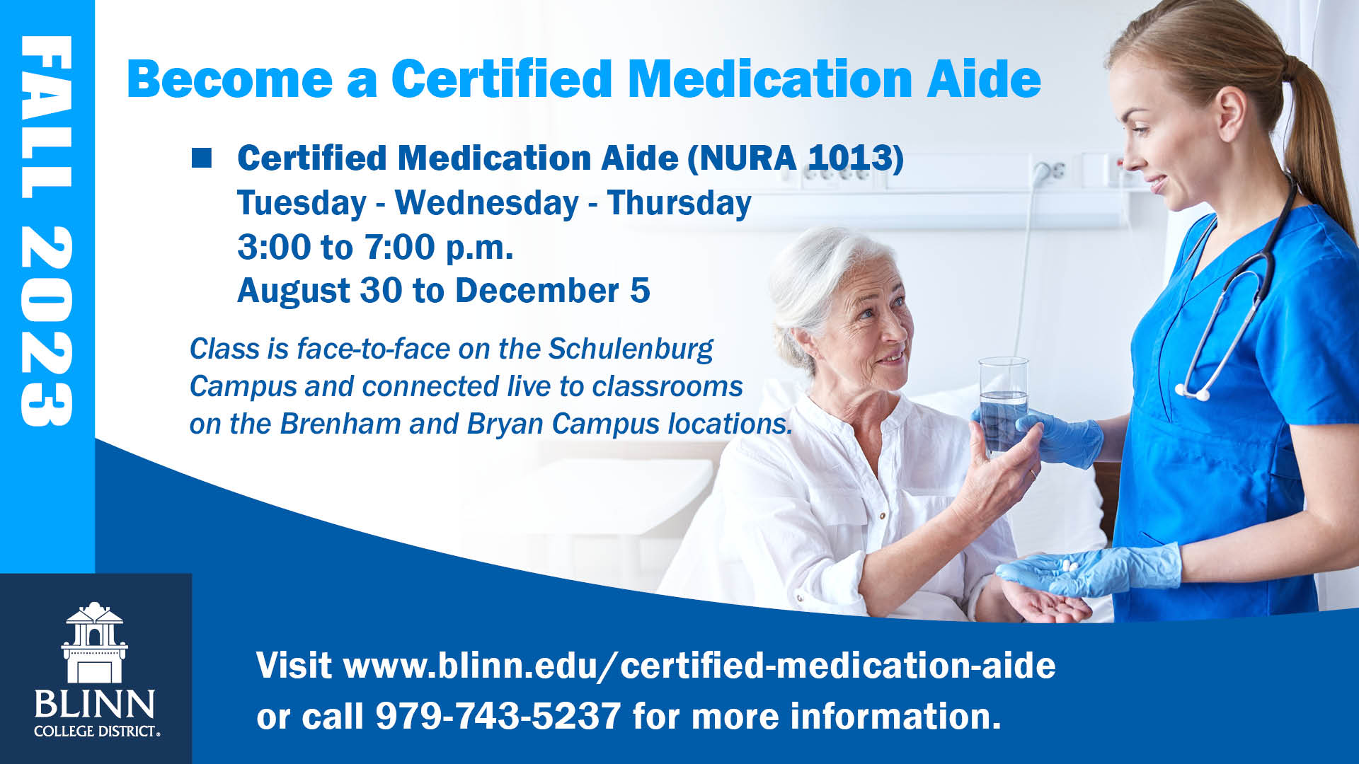 For more information, call 979-743-5237 or select the Certified Medication Aide link at www.blinn.edu/workforce/non-credit-healthcare-information-sessions.html.
