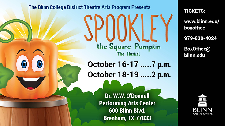 “Spookley” will be staged at 7 p.m. Thursday and Friday, Oct. 16 and 17, and 2 p.m. Saturday and Sunday, Oct. 18 and 19, at the Dr. W.W. O’Donnell Performing Arts Center at 600 Blinn Boulevard on the Brenham Campus. School preview performances will be at 10 a.m. and 1 p.m. on Oct. 16 and 17.